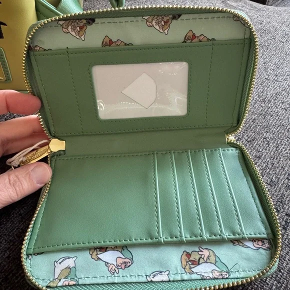 NWT Loungefly Adorable Disney Princess Sleepy backpack and wallet set. Features a playful Sleepy design with green and cream colors.Mini backpack 11”x9”x5”. Adjustable shoulder straps, lined with pattern(see photos) & zip closure. Wallet zips all around, lined interior, clear I’d window. Card slots & bill compartment.Dimensions 6”x4”SFPF