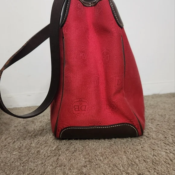 Stylish red handbag with brown accents. Features Dooney & Bourke logo.Good condition except strap had minor flaw (shown).