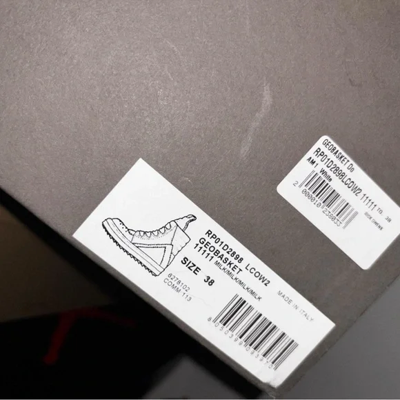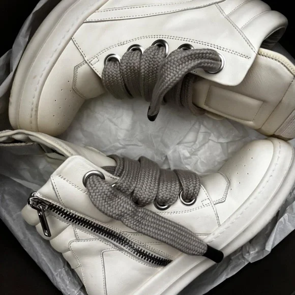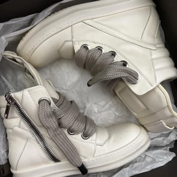 Stylish cream high-top sneakers featuring gray laces. Perfect for a modern look.