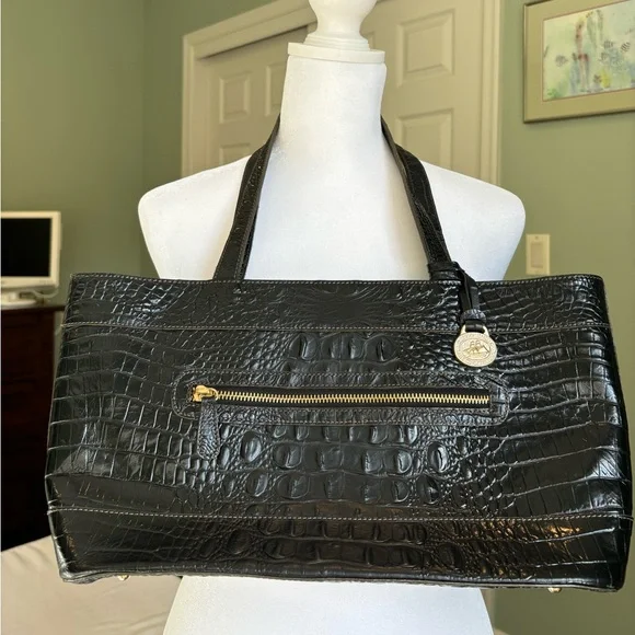 Black Crocodile Embossed Black Leather shoulder bag by Brahmin. Roomy inside with one zippered compartment and two pockets and front has zippered compartment . Lots of room for everything!