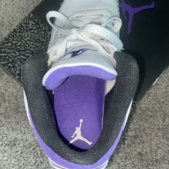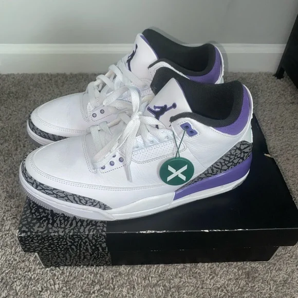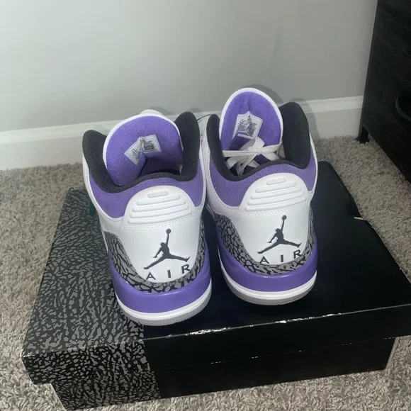 This is the Jordan 3 “Iris” it’s a great white and purple color way with the famous Jordan elephant print as well. It’s a size 9.5. It’s in great condition and has no damage or scuffs on the shoe at all, they are basically brand new only worn 2-3 times and are in great shape 9.5/ 10 condition.