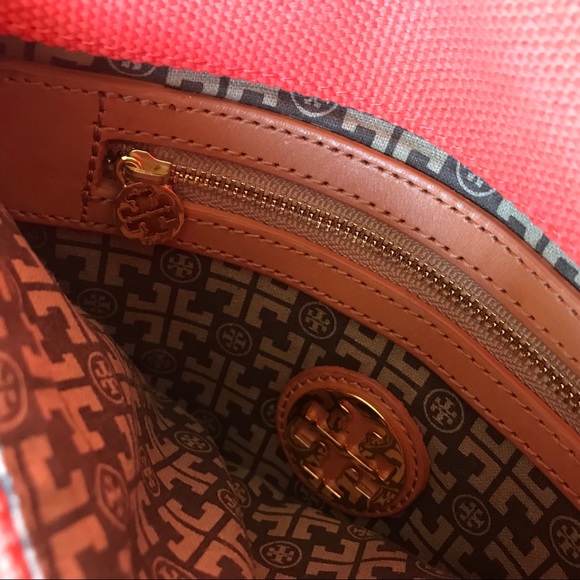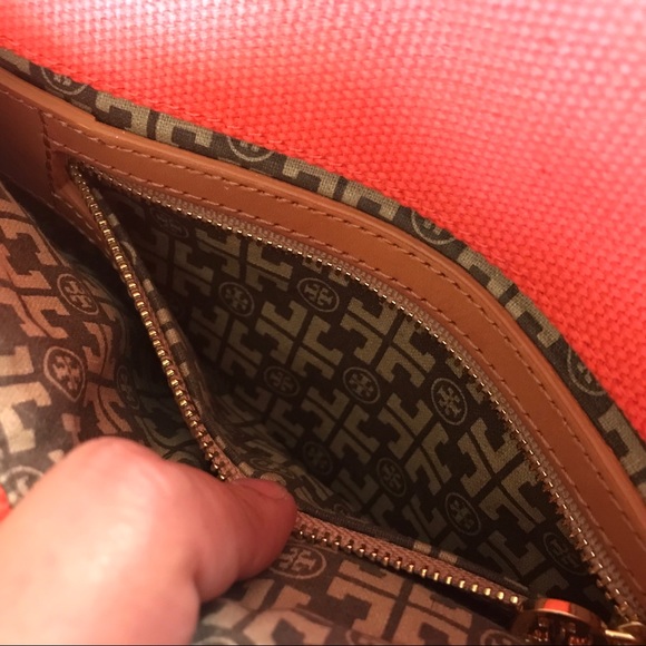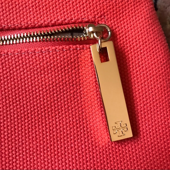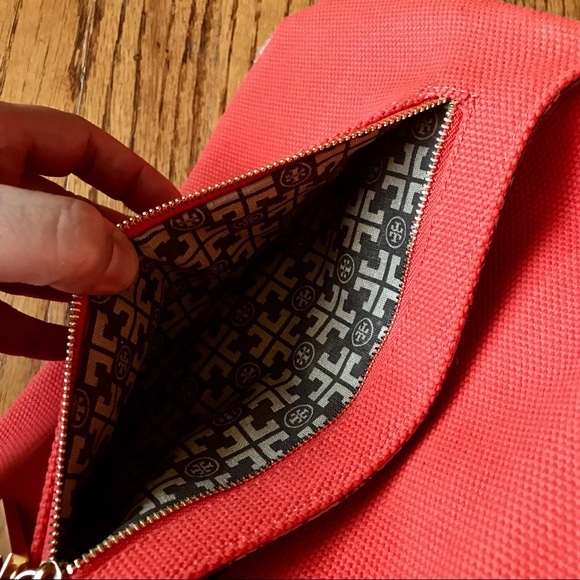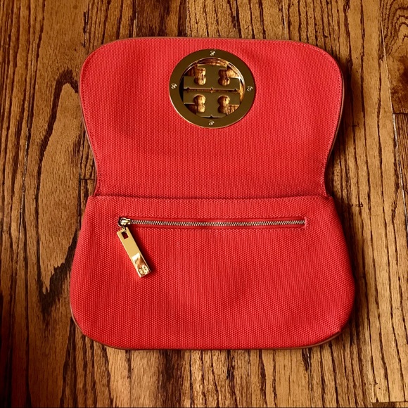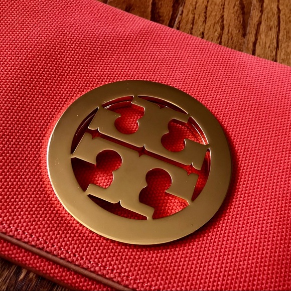 TORY BURCH CANVAS AMANDA CLUTCHTory Burch Amanda clutch with gold-tone hardware, logo placard at front face, single zip pocket at front flap underside, beige signature lining, single zip pocket at interior wall and fold-over flap closure. Used on ONLY 1 occasion, used ever so gently! Height: 6.5"Width: 11.5"100% authentic!!!