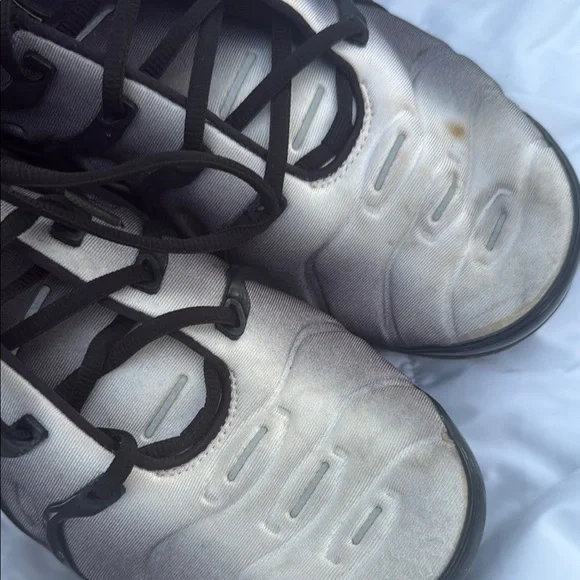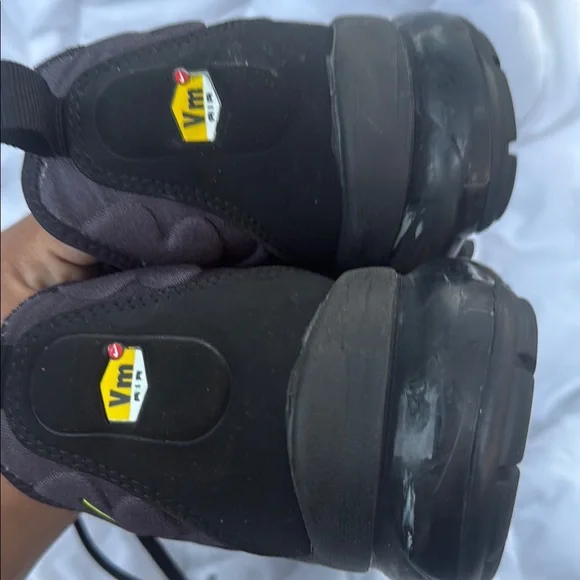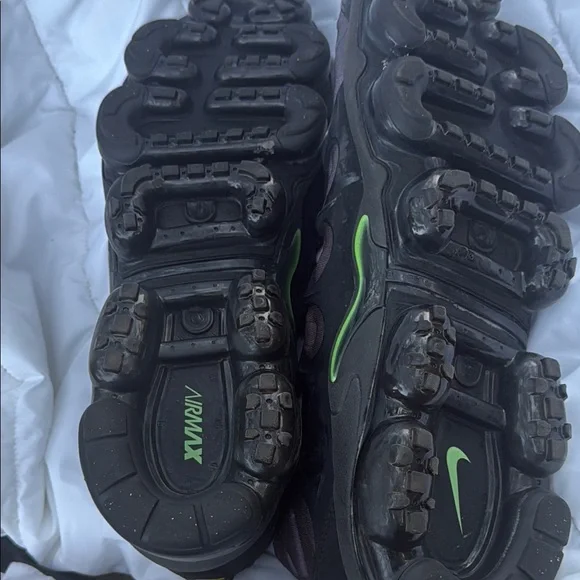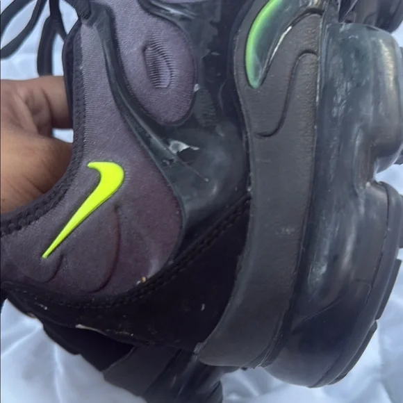 Nike Air VaporMax Plus sneakers in black and gray with neon green accents. Stylish and comfortable for everyday wear.