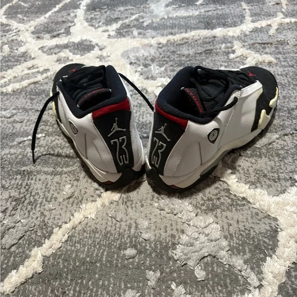Stylish black and white athletic sneakers with red accents. Perfect for sports and casual wear.