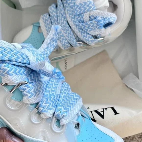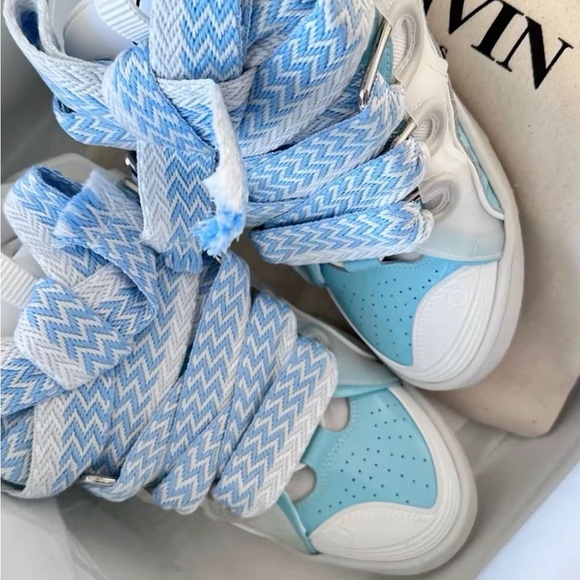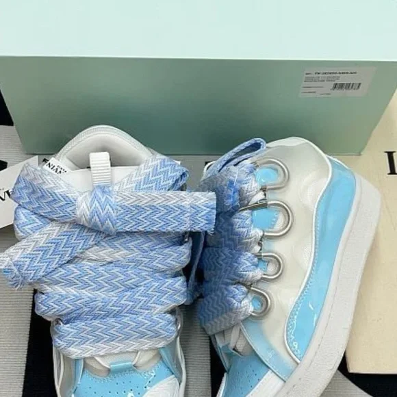 Stylish high-top sneakers with a unique zigzag pattern. Features a blend of blue and white colors. Perfect for casual wear.