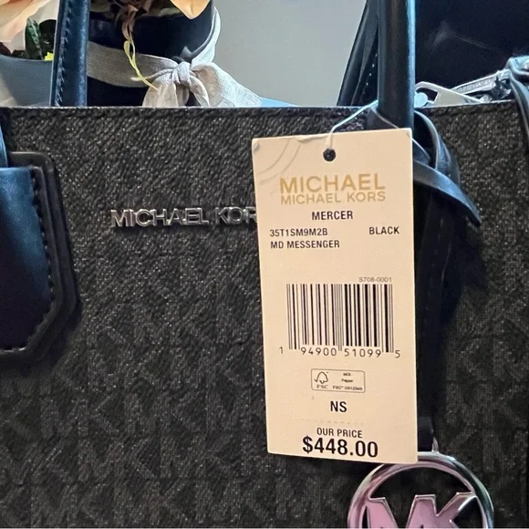 Small black Michael Kor bag• Crossbody bag• Logo-print canvas• 90% coated canvas/9% polyester/1% polyurethane• Trim: 100% leather• Silver-tone hardware• 8.75"W X 7.5"H X 4"D• Handle drop: 4.25"• Adjustable strap: 22.25"-24.5"• Exterior details: detachable crossbody strap• Interior details: center zip compartment, 3 card slots• Pocket lining: 100% polyester• Imported• Style # 35T1SM9M2B
