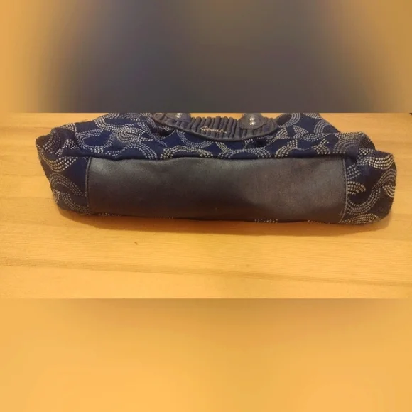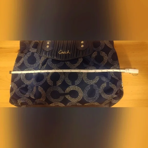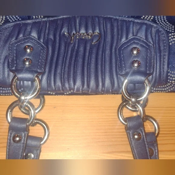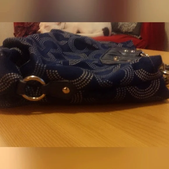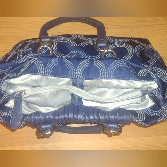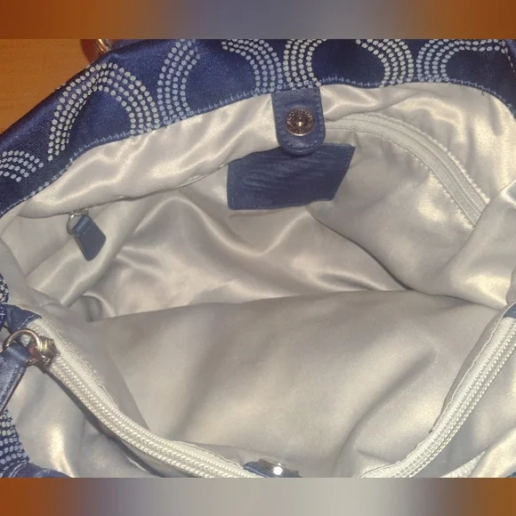 Blue Coach poppy print style shoulder bag. features three separate pockets for lots of storage space inside! middle pocket zips while the outside two have a magnetic clasp for closure. still features traditional inside zip pocket and two cellphone top pockets as well. does have some fray wear on leather shoulder straps (see photos) measures 17" wide and 10" tall. great condition !