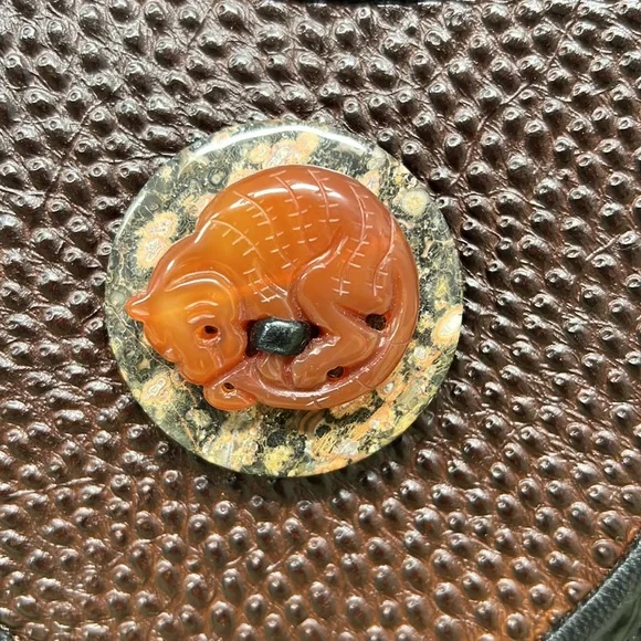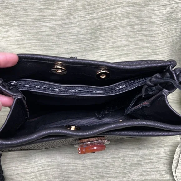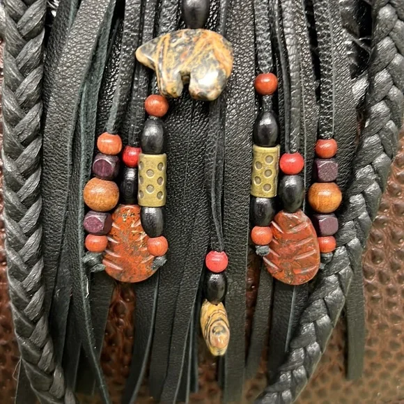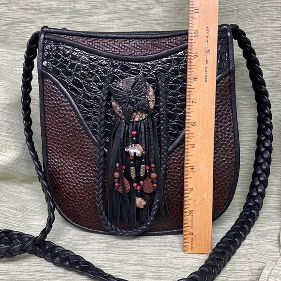 100% leather inside and out!Beautiful handmade leather bag features ostrich skin, crock patent, and embossed woven leather pieces. Fringe is soft leather and the buttons and accessories are carved stone and wooden and metal beads. Butterfly is beautifully carved as well as the tiger on the reverse side. Inside has a leather zippered pouch and several slot dividers. Purse measures 10.5” tall x 9,5” wide x 4” deep with a 20” drop from the shoulder with 7” more for a longer drop of desired. Purchase at a juried artisan show and used only twice. Excellent condition!