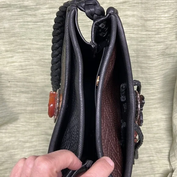 100% leather inside and out!Beautiful handmade leather bag features ostrich skin, crock patent, and embossed woven leather pieces. Fringe is soft leather and the buttons and...