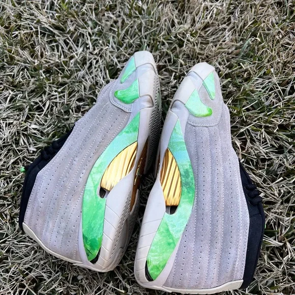 Clean, worn lightly conditionLook great in hand, nice grey suede with green jade midsoles and accentsClassic design and shape with gold tip lacesSmall stain on one soleSize 7.5 Mens / 9 WomensNo box