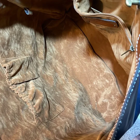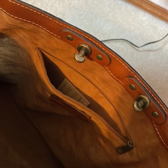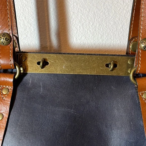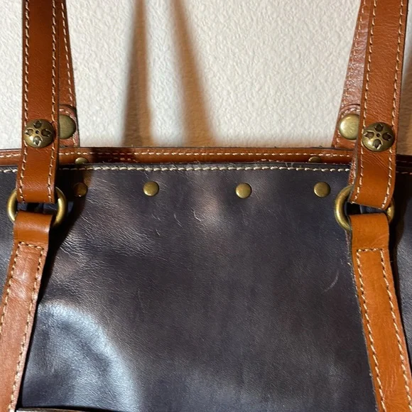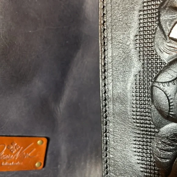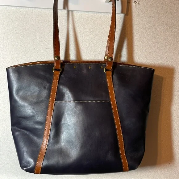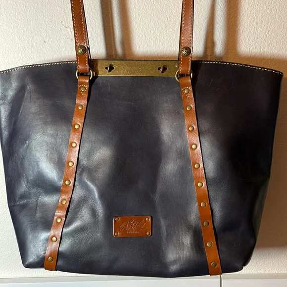 Dark blue/black, color called Eclipse, large tote bag by Patricia Nash. Measures approximately 13“ x 19“ wide at widest point. This is a dark blue. Last picture shows a black handbag next to the dark blue. Bag is in excellent condition, used very few times does have some scratches on the brass plate shown in the picture. no