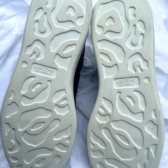 These Alexander McQueen sneakers feature a sleek low-top design with a predominantly black upper and a contrasting thick white sole. The traditional lacing system and minimal stitching enhance the modern aesthetic, making them a stylish choice for any casual outfit.