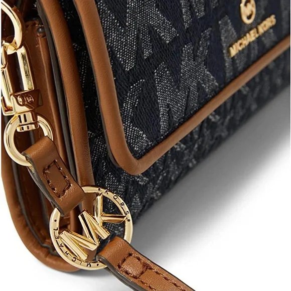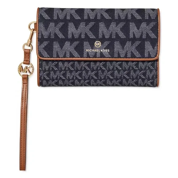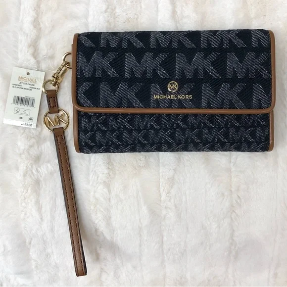 NWT MICHAEL KORS Signature Jet Set Charm Dark Denim Blue Flap Phone WristletMICHAEL KORSNew with tagNever used!Perfect for the days when you want to travel light or to use as a wallet in your favorite handbag, the Signature Jet Set Charm Flap Phone Wristlet by MICHAEL Michael Kors will charm its way into any wardrobe.7-1/2"W x 5"H x 1-3/4"D; 0.54 lbs. approx. weight8-1/2"L wrist strapSnap closureGold-tone hardwareInterior zip pocket, 6 card slots, ID window, bill compartment & tech pocketFits most smart phone models1-year manufacturer´s limited warrantyCotton; trim: polyurethane; lining: polyesterSpot cleanRETAIL PRICE: $158.00If you have any further questions feel free to message me!No returns.Thank you and have an amazing day!