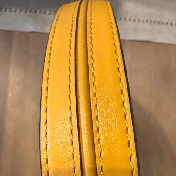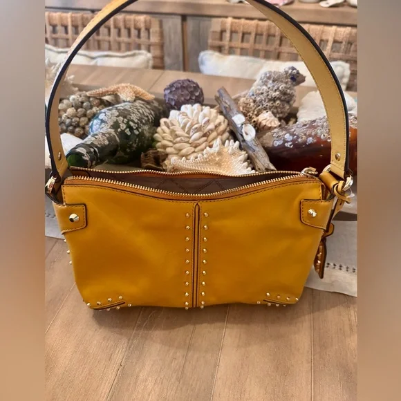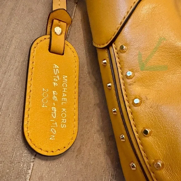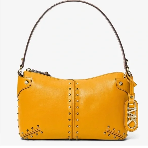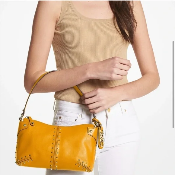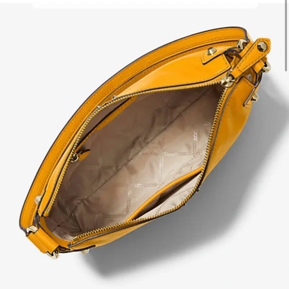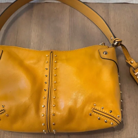 Inspired by New York City´s Astor Place, Michael Kors´ large Astor bag flaunts clean lines and studded hardware for a downtown edge.Shoulder strapInterior: one slip, one zip pocketTop-zip closureLeather - Golden YellowLining: polyesterImportedSIZEAbout 11"W x 6.75"H x 2.5"DShoulder strap, about 7.25" dropNew, never used, plastic tags intact but paper tags missing. Very tiny scuff on side (see pic). Likely removable. Quick ship!