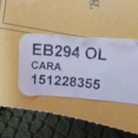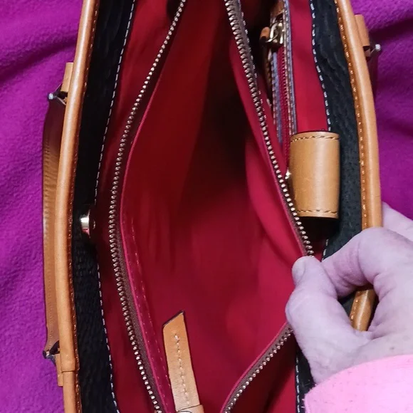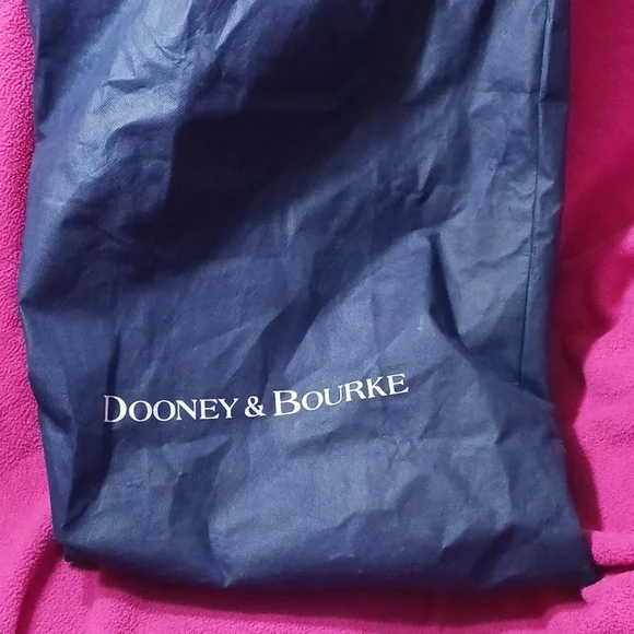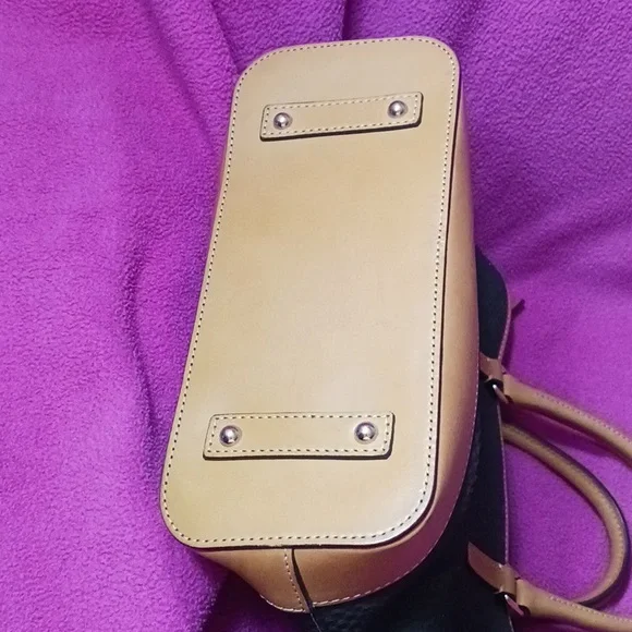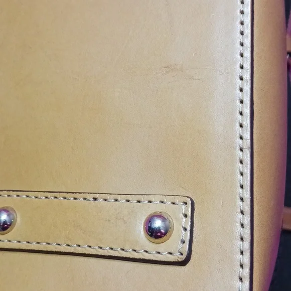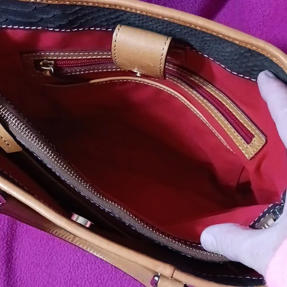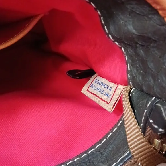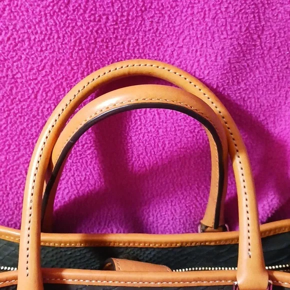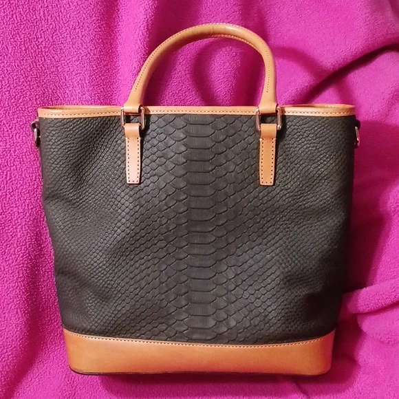 Like new condition Dooney and Bourke Cara handbag.Tan vachetta leather trim and handles over olive croc embossed leather body (it´s very hard to see the olive, in fact I think it just looks like dark brown).Handle drop length: 5.5",rings to attach crossbody strap (not included).Top has leather tab snap closure with 2 large compartments inside - one side has zip and slip pockets, other side has 2 slip pockets.The two main sections are separated with a center zip divider compartment.Inside key strap, 4 metal feet.Some small blemishes on bottom of bag but otherwise in perfect, like new condition. Comes with dust bag. Measures H 10.5" x W 4.5" x L 10.5". P1
