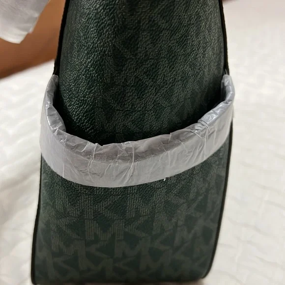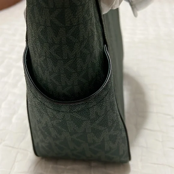 Dark green logo shoulder bag. Two side pockets, front outer pocket. Cell phone pockets inside.