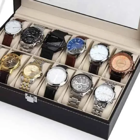 Black leather Watch display case.Removable pieces and slots large enough to hold oversized watches such as Rolex tag Heuer Movado Michele Cartier Versace. Neutral interior colors...
