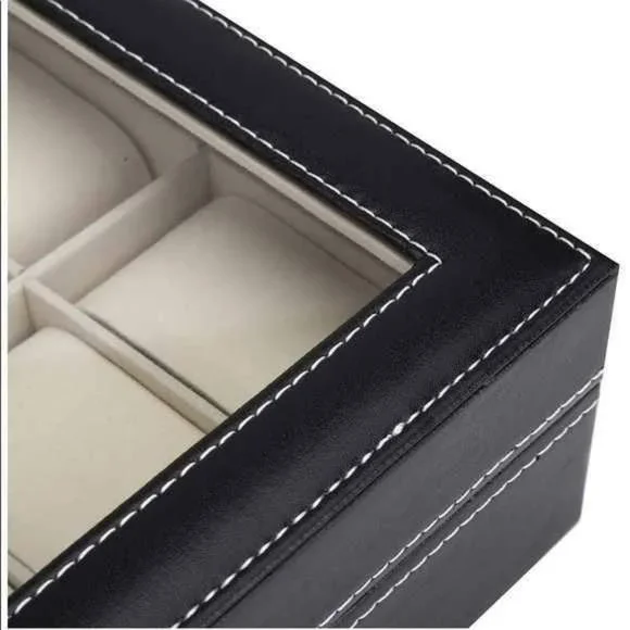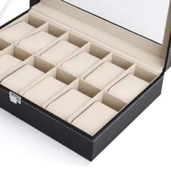 Black leather Watch display case.Removable pieces and slots large enough to hold oversized watches such as Rolex tag Heuer Movado Michele Cartier Versace. Neutral interior colors vary between gray and sand