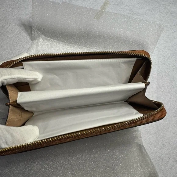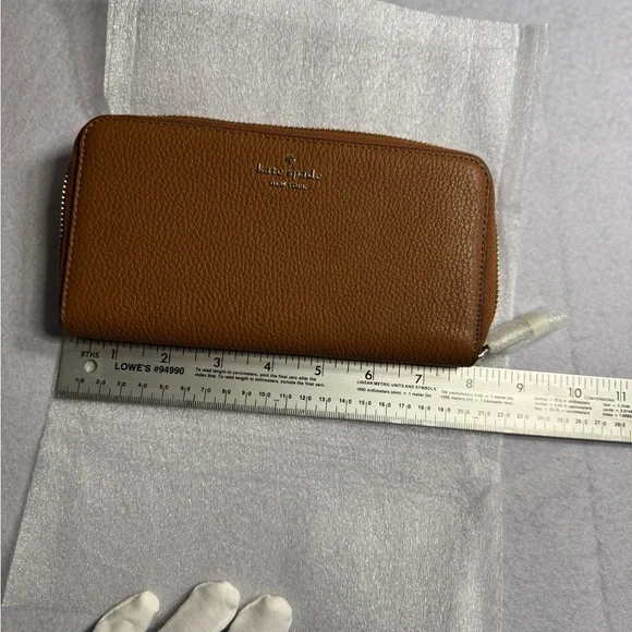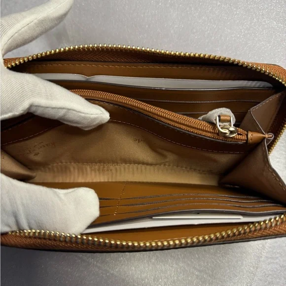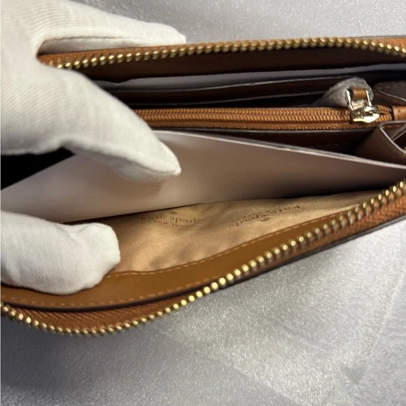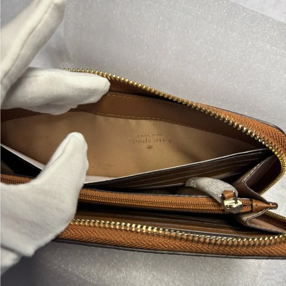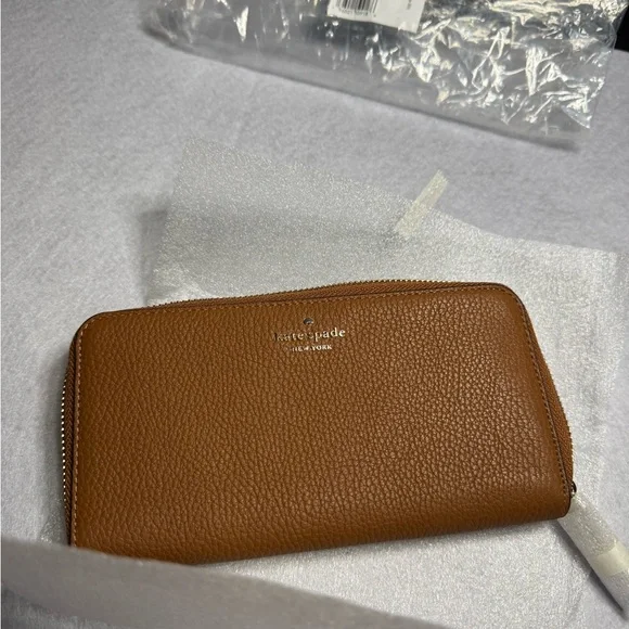 This authentic pebble leather wallet with gold hardware has a backflip pocket two slip pockets, 12 credit card slots, zip closure, a zip coin compartment with the with the metal Kate Spade logo. The color is a warm gingerbread. I also have a matching purse in my closet.