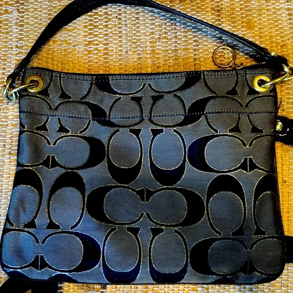 Gorgeous and looks brand new COACH crossbody hand bag. Black signature canvas with gold accents. Brass hardware 1 outer and 1inner zip pocket, 2 inner slip pockets. Pristine in/out. Long detachable 44.5” wide strap and shorter handle strap