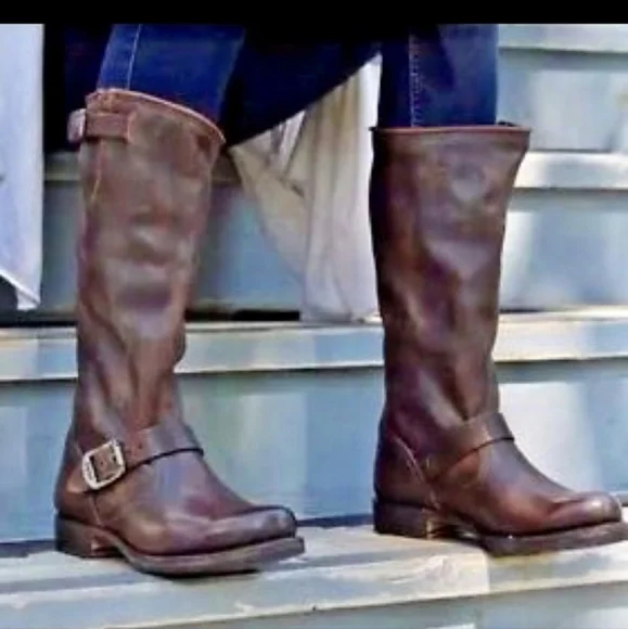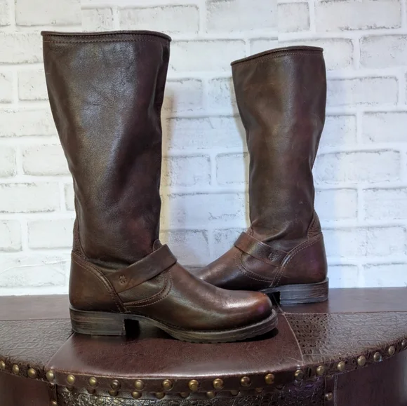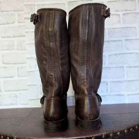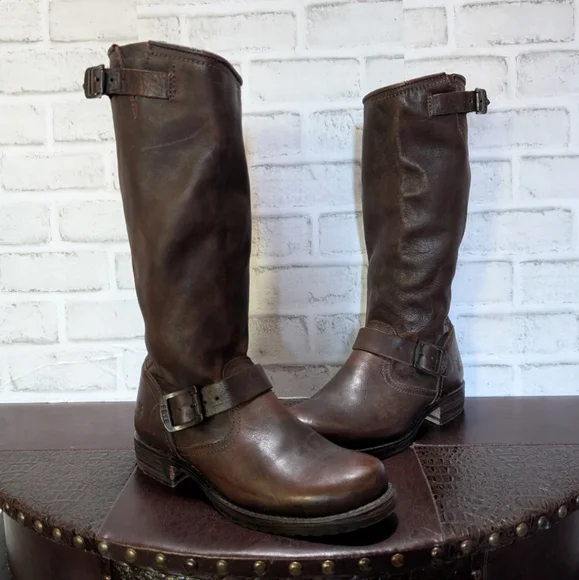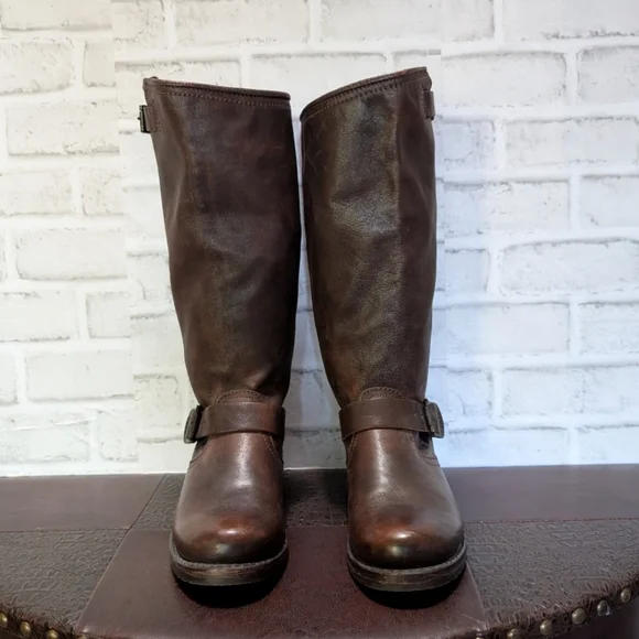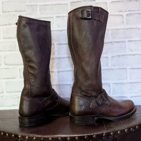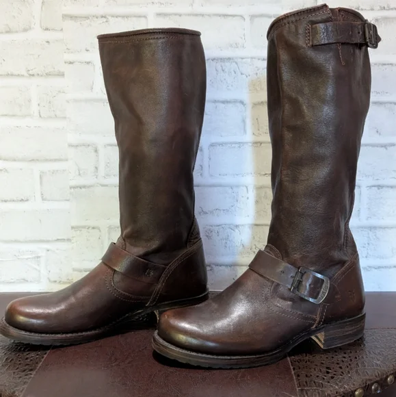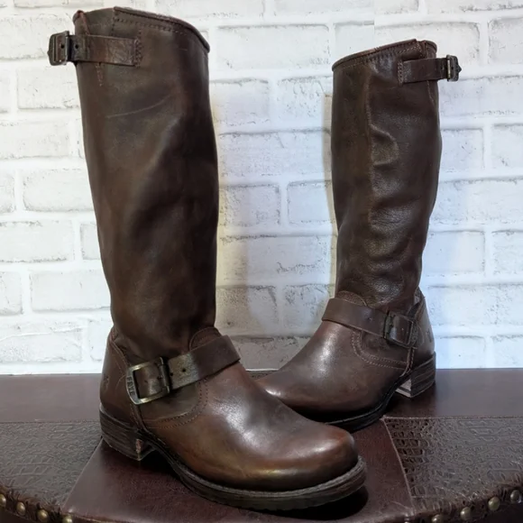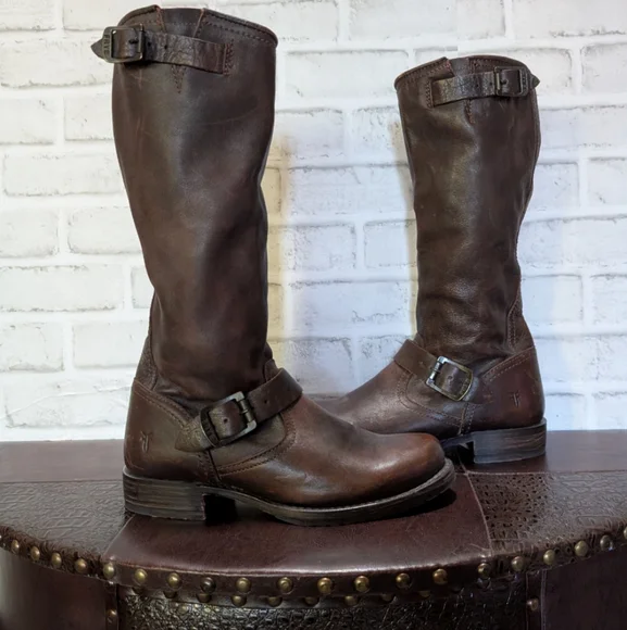 FRYE Veronica Slouch Motorcycle Boots Women´s Size 8 in Dark BrownLike new condition ( worn once) This is the boot you wear leaning against the wall at local dives, inspiring people to wonder who the mysterious woman is. A tough engineer boot with a soft, relaxed fit, crafted from soft vintage leather. The rubber lug sole gives you traction when it´s suddenly time to up and go, go, go...The Veronica slouch moto-inspired tall silhouette boots are detailed with two rounded metal hardware buckled straps, Goodyear welted construction and did we forget to mention that they´re very easy to get on. They´ve been impeccably crafted from supple Italian leather so lovingly washed and antiqued.DETAILS- Italian leather- Leather lined- Rubber outsole- Antique metal hardware- Goodyear welt construction- 13 1/2" shaft height-1 1/4" heel height outsoleTags: FreeBird by Steven casual Stretwear festival band of Gypsies johnny was Anthropologie Free People Vince Madewell Zara Reformation Abercrombie and Fitch Forever 21 combat boots booties leather aquatalia Michael Cors RRL doney Bourke coach Burberry, Summer/spring/fall/ winter, festival, school, date, weekend, party, casual/formal wear, vacation, Easter, Mother´s Day, cruise, beach, date night, friday, weekday, church, school, college, streetwear, concert, movies, picnic, photoshoot, graduation, birthday, anthropologie, zara, free people, j.crew, Frye, Ralph Lauren. Bed Su boho torid