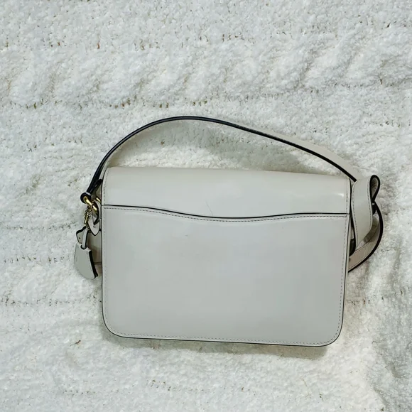 This Coach crossbody bag combines elegance and functionality with its sleek white leather-like finish and gold-toned hardware. The adjustable strap offers versatility, while the compact size makes it perfect for carrying essentials. Its structured design and prominent gold clasp add a touch of sophistication to any outfit.