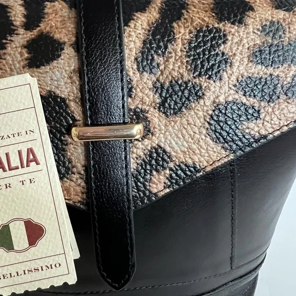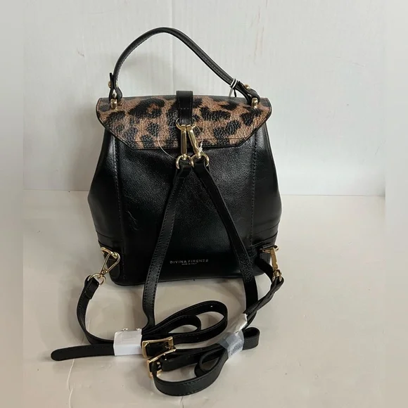 NWT Divina Firenze Art Trilli 3-way wear bag Backpack, Top handle and shoulder.Black/leopard print, gold tone hardware, 1 interior zipper pocket, 2 interior slot pockets Measures: 9.5”X9”X5.5”