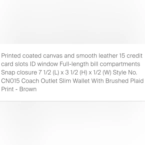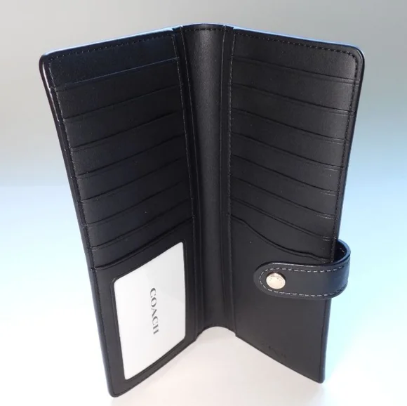 Printed coated canvas and smooth leather 15 credit card slots ID window Full-length bill compartments Snap closure 7 1/2 (L) x 3 1/2 (H) x 1/2 (W) Style No. CN015 Coach Outlet...