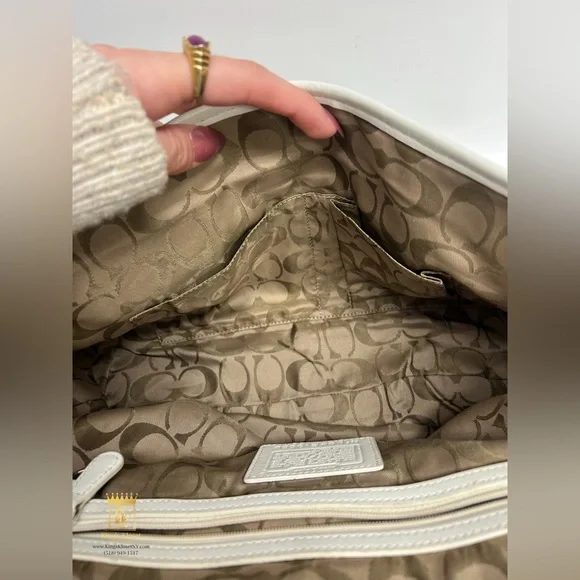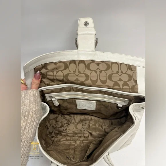 Coach soho hampton flap satchel 13x3x9All closures are functional. 3 interior pocketsThe item shows signs of wear from normal use-Blue stains on exterior,Worn leather,Marks...