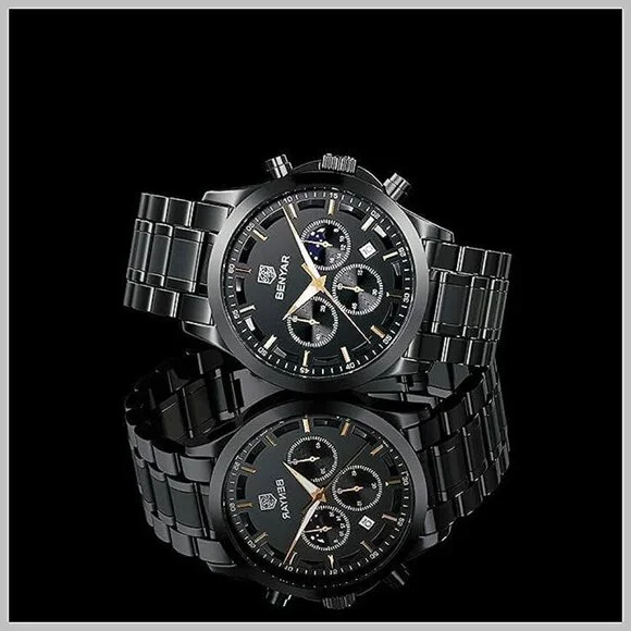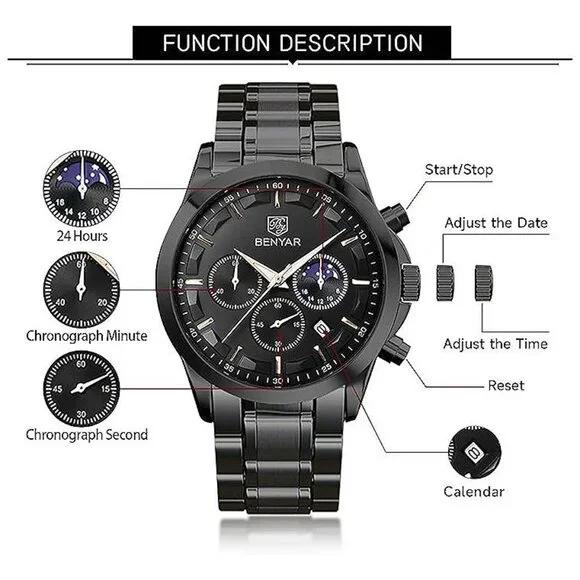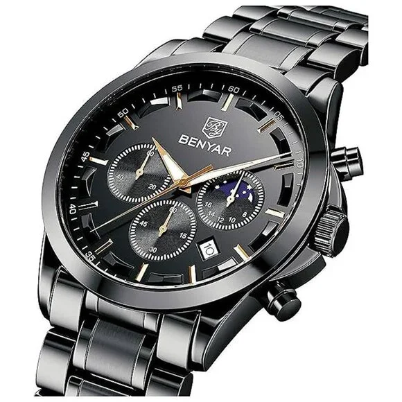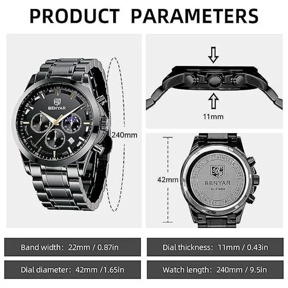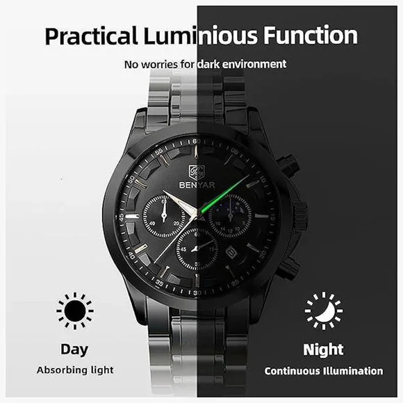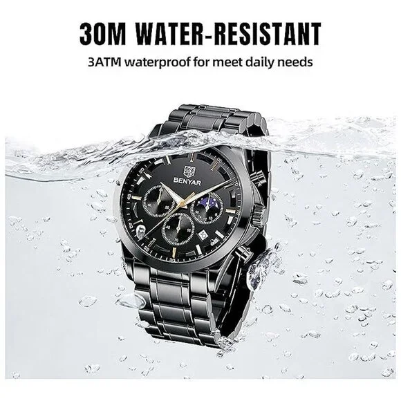 * ACCURATE TIME KEEPING: BENYAR watches men use the original imported branded movement to provide stable and accurate travel time for the watch, it will always tell you accurate time in any occasions or important moments. Built-in high-quality BATTERY, the service life is as long as 2-3 years. Classic big face mens watches, fashion hands/markers, calendar window and three chronograph subdials, provide more functions and allow you to easily grasp the rhythm of time. * COMFORTABLE AND DURABLE: When you need a quality analog quartz watch men to prove that you value your time and enhance your taste. BENYAR stainless steel strap watch for men not only makes a comfortable sense for your wrist but also easy to match your outfit. Our men´s wrist watches are suit for both the adventurer and the everyday man looking for a stylish style. Our passion drives us towards perfection, putting in hours of work to get a truly amazing and unique end product. * WATERPROOF LUMINOUS CHRONOGRAPH: 3ATM Waterproof, BENYAR´s waterproof watches for men can meet daily waterproof needs, bear sweat, accidental rain or water splash, but Not suitable for bathing, swimming, diving. After absorbing enough light energy, you can check the time of the watch in a dark environment. Multi-Function chronograph watch for men with three sub-dials for second, minute and hour that can be used as timers. It is a multifunctional stainless steel wrist watches for man.