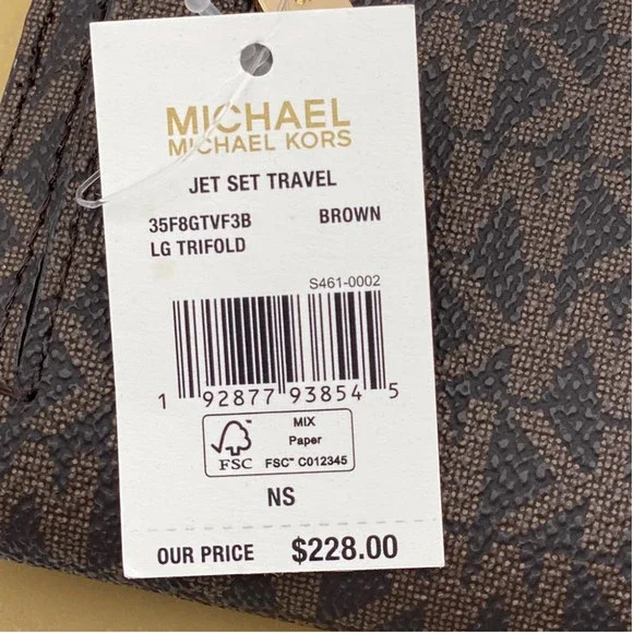 Brand New with tagJet Set Travel Large Trifold Wallet 100% Authentic PVC Coated Canvas and Saffiano Leather inside Signature Brown color with Gold tone hardware Trifold Wallet with snap button closure 16 credit cards slots 1ID Window 4 bill compartments 7 (L) X 4 (H) X 1 (D) zippier pocket on the back