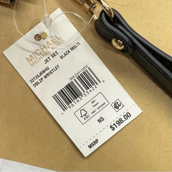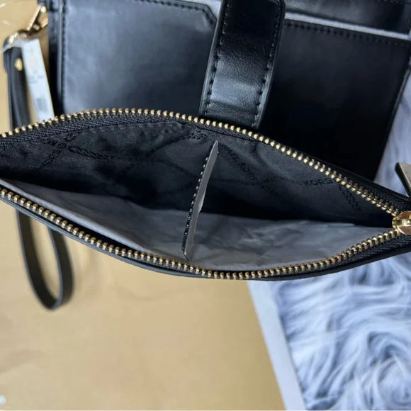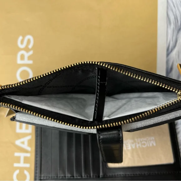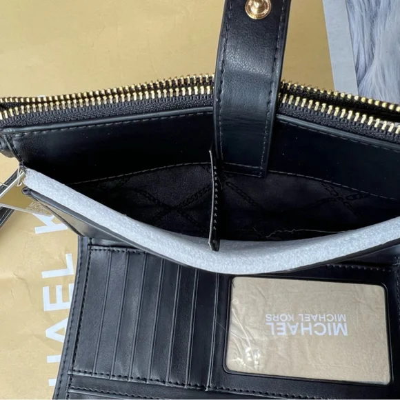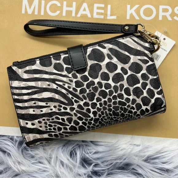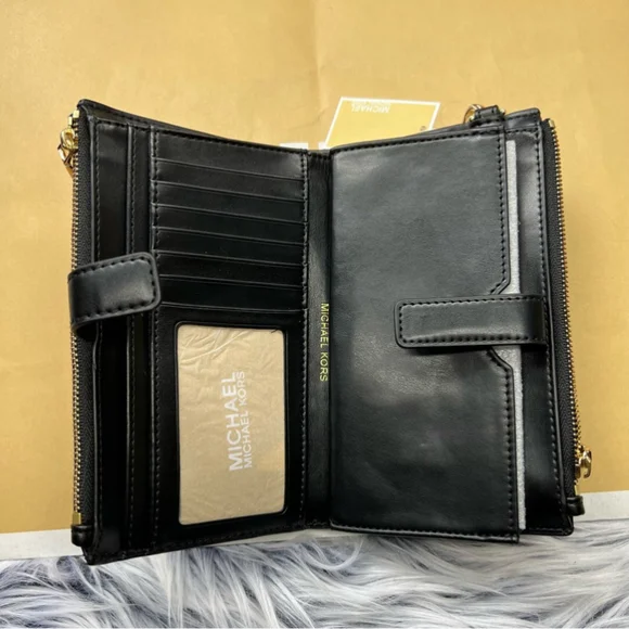 MICHAEL KORS LARGE DOUBLE ZIP WRISTLETWALLET PHONE CASE CLUTCHBlack MultiMICHAEL KORS LARGE DOUBLE ZIP WRISTLET wallet, clutch,Gold tone hardware6 credit card holders1 ID holder2 slip compartments2 zip pocketsa phone holder slot and a large bill section accessible from the side7.25" × 4.25" × 1"Comes with a detachable wrist strapThis is an outlet styleMICHAEL KORSJET SET TRAVEL32T2GJ6W4UBLACK MULTIDOUBLE ZIP WRISTLET