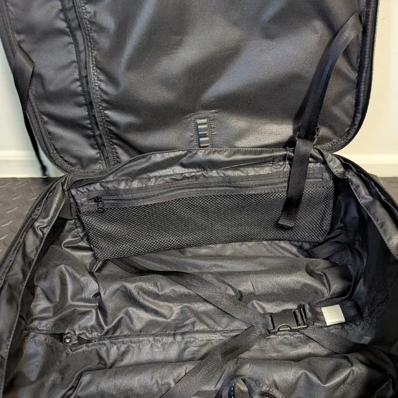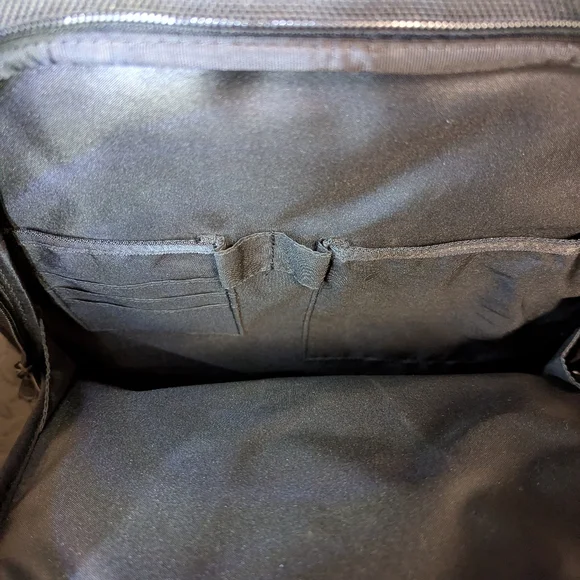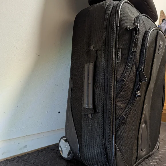T-Tech by Tumi Carry OnExpandable.Nylon. Two wheels In good condition, signs of use on the exterior is noticeable. Interior is clean.Zippers zip.Missing interior mesh holder (I...
