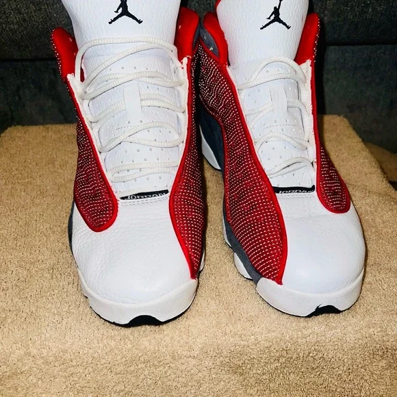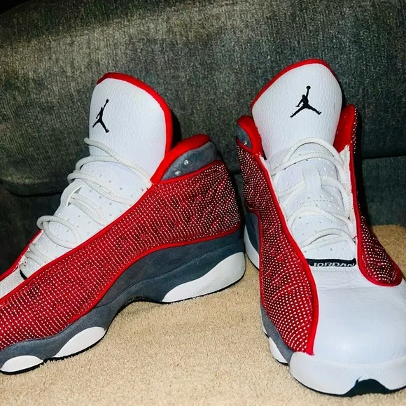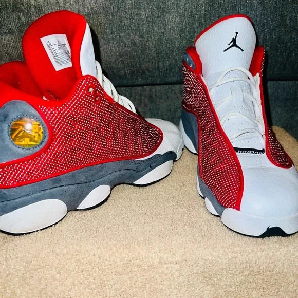 Air Jordan 13 Retros, in good condition, barely worn. Bright red, white, and grey on the soles.