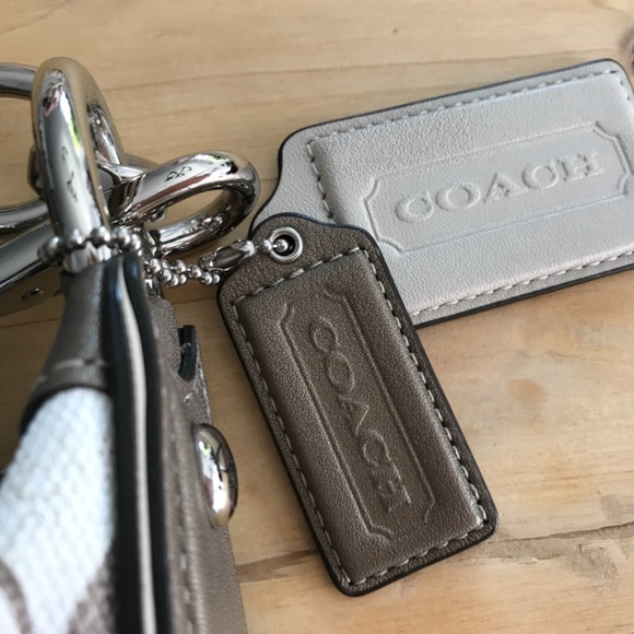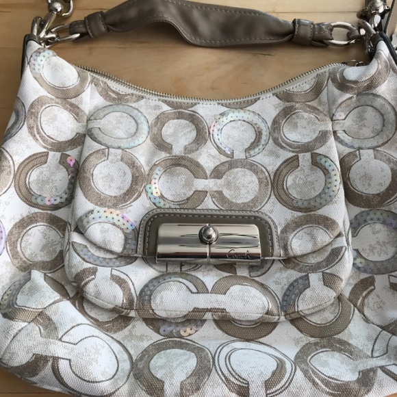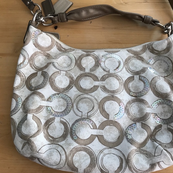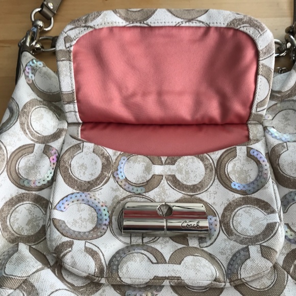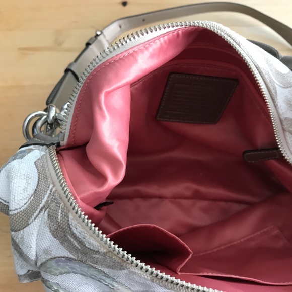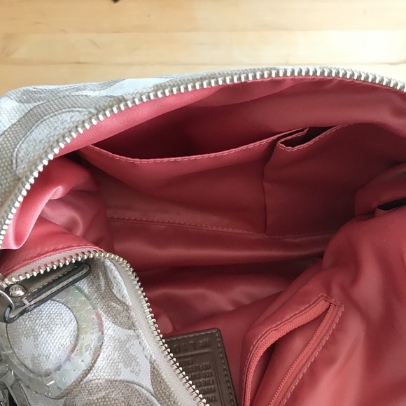 Coach Handbag, Brand New…never used…no stains rips, holes Brand New, with 2 straps 1 for shoulder that isRemovable , also adjustable, another strap to use that is shorter to carry in hands or on shoulder( leather)It’s lined with a peach color, 1 zipper pocket, 2 pouches on other side.A pocket on outside that is kept closed by heavy metal closureIt’s their monogram bag , it has serial number inside, for Authentication with leather band.All silver heavyHardware.it has 2 ornamentals.