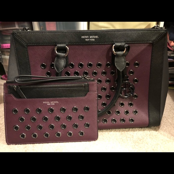 NWT edgy and practical wristlet Details:Size: 8” L x 6”Colors: Plum and BlackGunmetal hardwareSatin interior fabric with HB logosBlack pouch can be used separately Comes with HB dust bagBag in photos sold separately (already sold)
