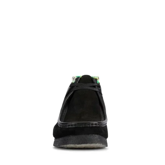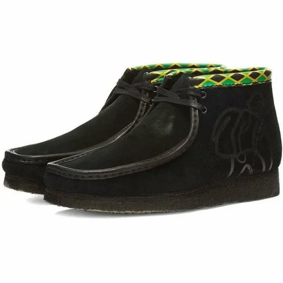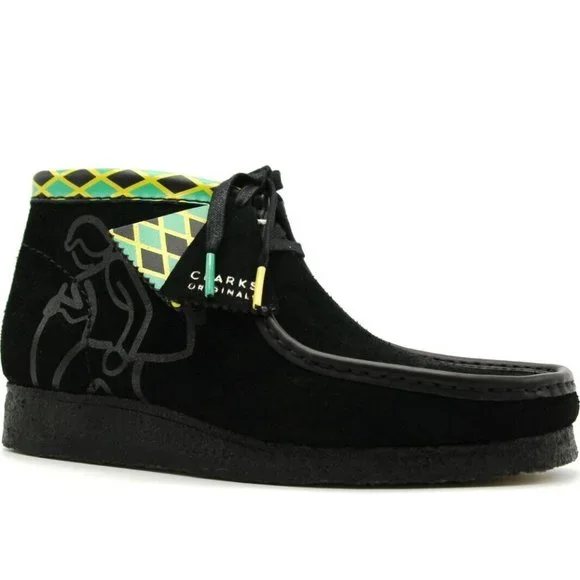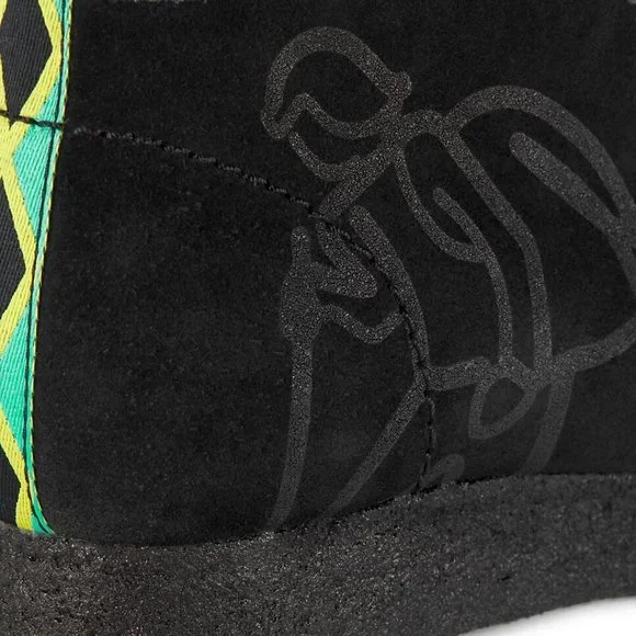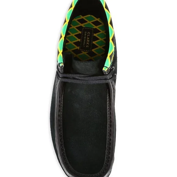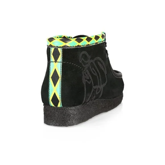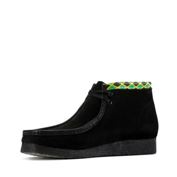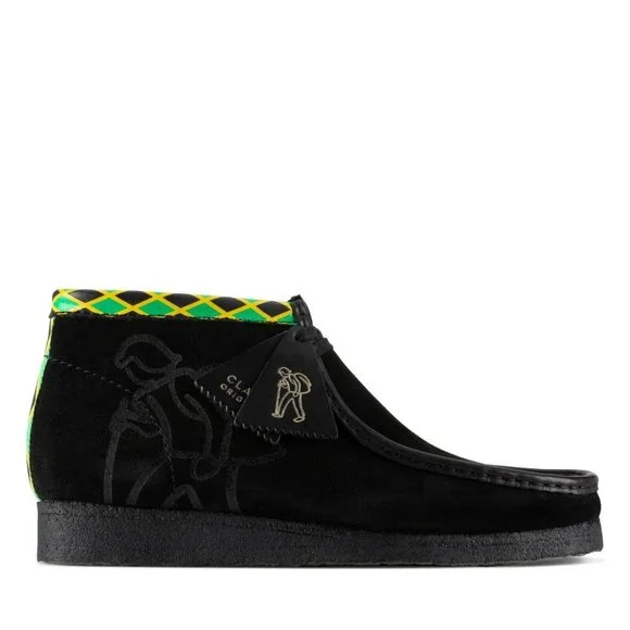 Since our Wallabee Boot first hit the streets of Kingston it has occupied a truly special place in Jamaican culture. We?re celebrating this unique connection to island life with a limited-edition new Wallabeestyle Jamaica Bee which sees a bold heritage pattern inspired by the Jamaican flag adorn the ankle trim heel and footbed of this classic black suede silhouette. The premium upper and custom fob feature a subtle design of the legendary Trek Man while coloured aglets on its laces make this shoe feel extra vibrant. All enhancing its signature moccasin construction our pioneering pair becomes a new icon that pays homage to the individuality Jamaica is so famous for.