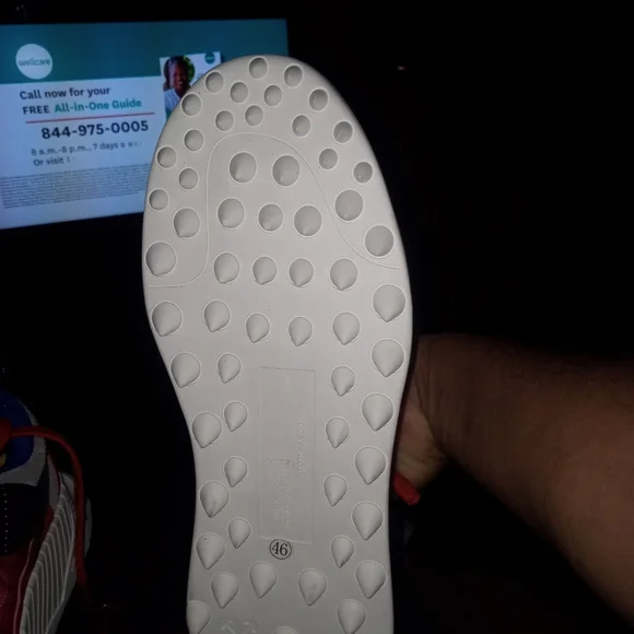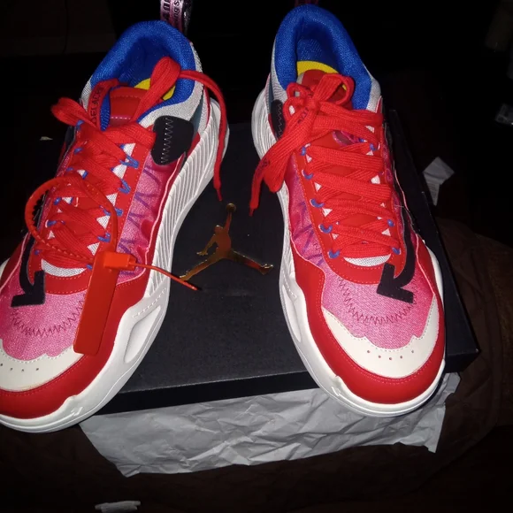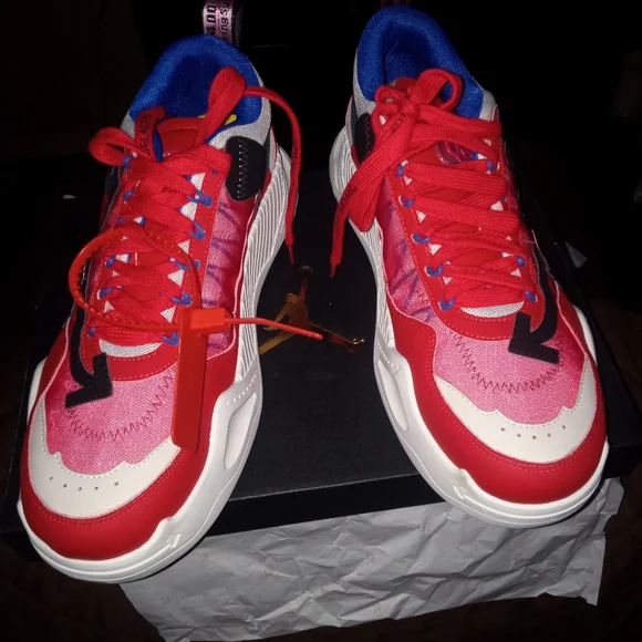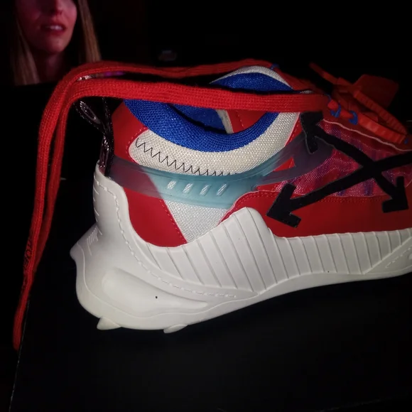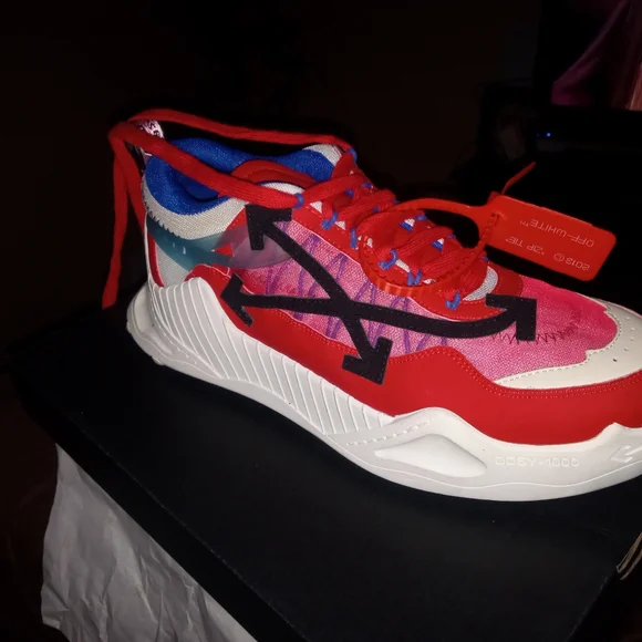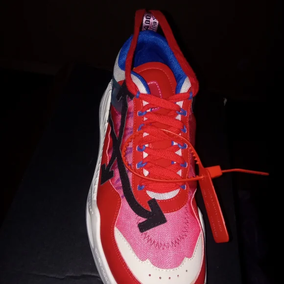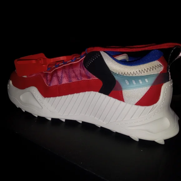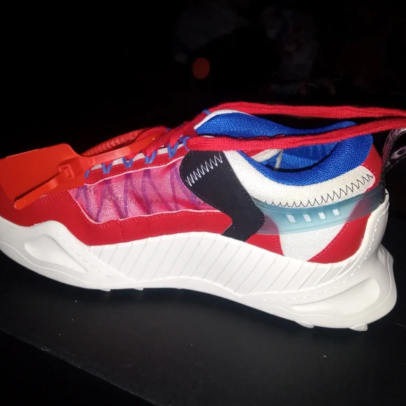 off white shoes size 12 colors are mostly red white some black also with a little bit of blue trim and white soles bottoms look like rubber cleats check out pictures for more information
