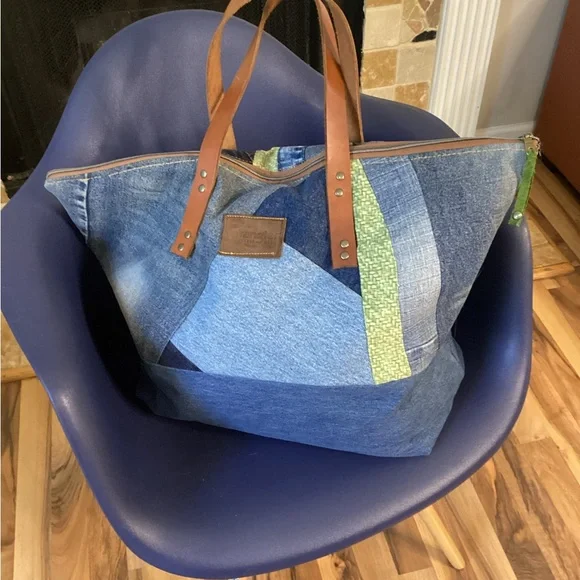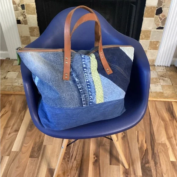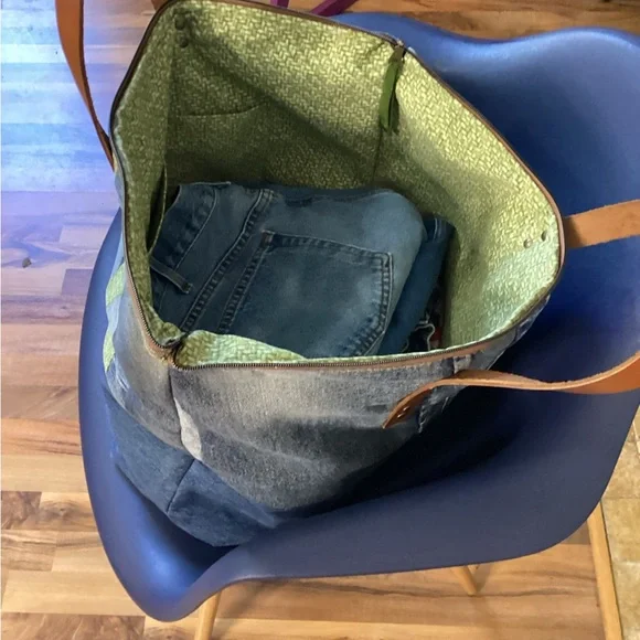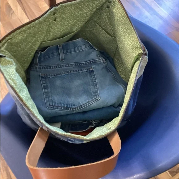 “Sage” is a Large, beautiful Weekender Zippered Bag with pockets leather straps, coordinating lining, and pockets Another One of a Kind “ DenimbyNeishta “ measures...