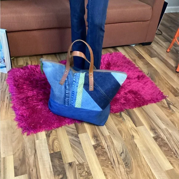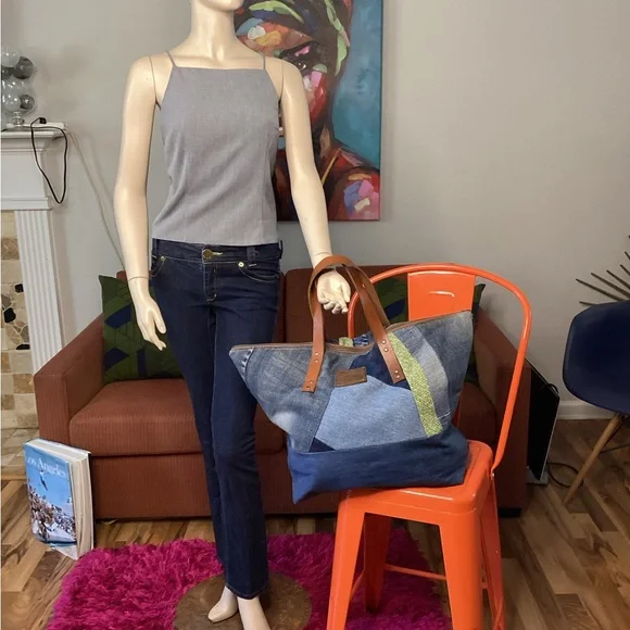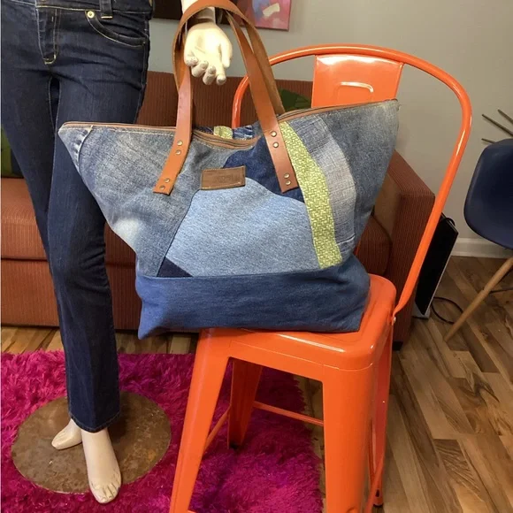 “Sage” is a Large, beautiful Weekender Zippered Bag with pockets leather straps, coordinating lining, and pockets Another One of a Kind “ DenimbyNeishta “ measures approximately 15 in. high and 21.1/2 in length
