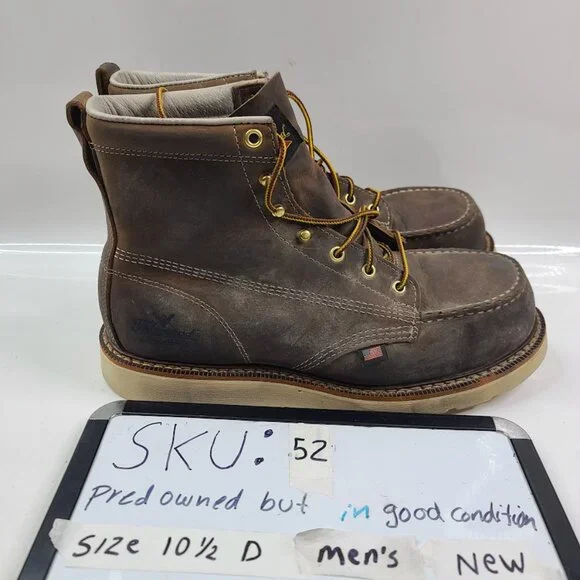 Thorogood Men´s Dark Brown American Heritage Leather Mac Toe Work Shoes 10.5DBrand: ThorogoodDepartment: MenColor: Dark BrownUS Shoe Size: 10.5Type: BootStyle: Work ShoeModel Name: Thorogood American HeritageUpper Material: LeatherClosure: Lace UpShoe Shaft Style: AnkleOccasion: Casual WorkCondition: NewSKU: 52