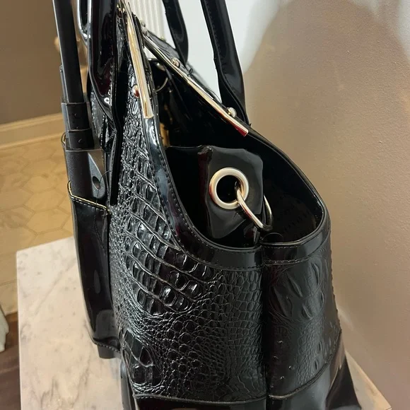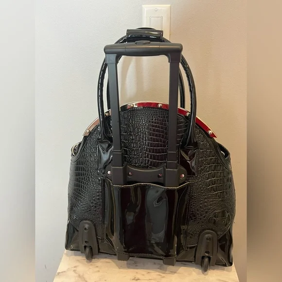 Alligator & Ostrich Pattern Faux Leather Handbag- Trolley Sleeve Leatherette Bag- Double Handles- Retractable Handle Extends To 38 Inches- Faux Leather With Lined Polka Dot Interior - 2 Interior Slip Pockets & 1 Zip Pocket- Three Separate Top Zip Openings- Silver Hardware- Laptop CompatibleMeasurements: 18.00" (L) X 9.50"(W) X 18.00"(H)
