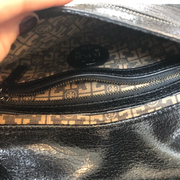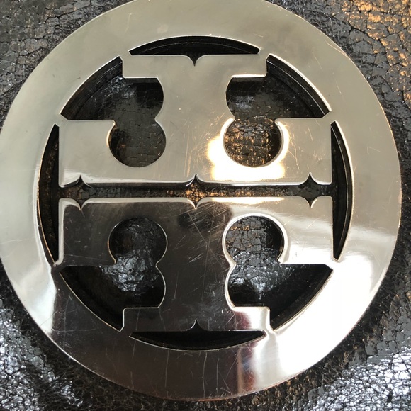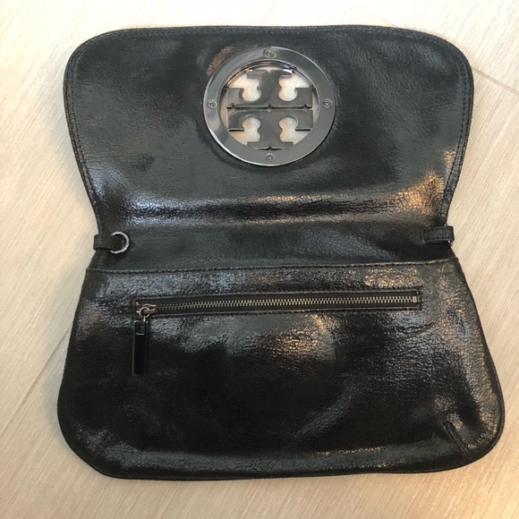 Tory Burch Clutch - Black pebbled Leather clutchGun metal emblem Previously loved but in good condition, slight scratch marks on metal Tory Burch emblemOriginally came with removable chain strap, but the strap broke so it is not included