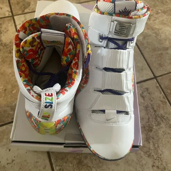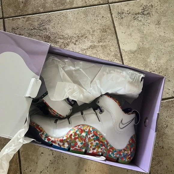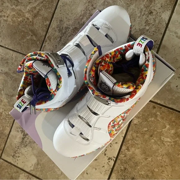 Step up your sneaker game with these Nike Zoom LeBron 4 sneakers in the Fruity Pebbles colorway. Featuring a foamposite upper material and a Zoom Air sole unit, these shoes offer comfort and style for any occasion. With a size 13 US shoe size, these sneakers are perfect for any man looking to add a unique touch to their outfit. The Nike Zoom LeBron 4 sneakers are part of the Nike LeBron product line and are complete with the style code DQ9310-100. The white, true red, mean green, and varsity purple colors make these shoes stand out from the rest. Ideal for athletic activities or casual wear, these sneakers are a must-have for any sneakerhead.