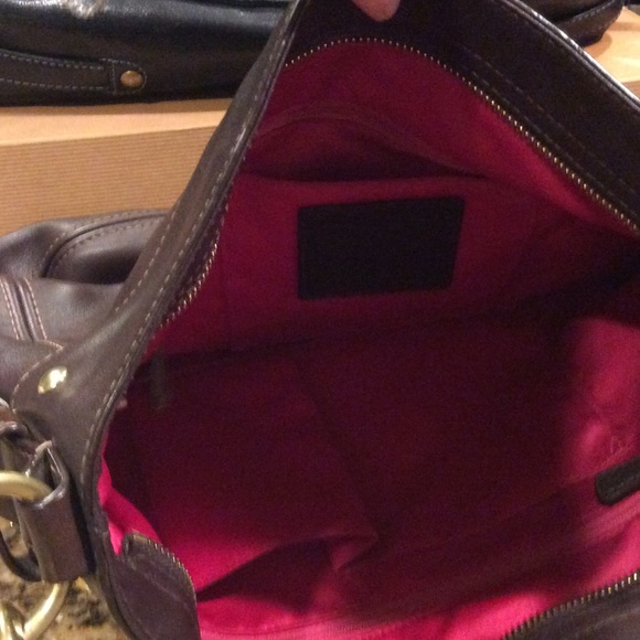 Beautiful dark brown handbag in like new condition with a hot pink interior :) It has 3 pockets on the inside and 2 zippered pockets. Comes with dust bag