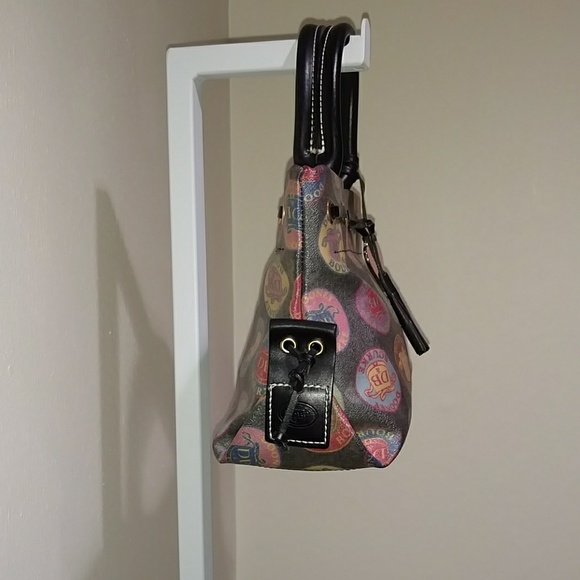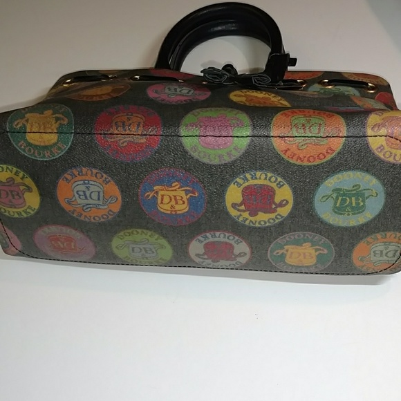 Genuine Dooney & Bourke rainbow hearts & tassel tote with top magnetic snap closure. Features black coated canvas with multi colored signature D & B medallions all over. Signature...