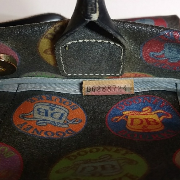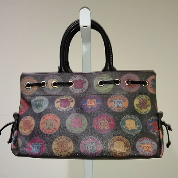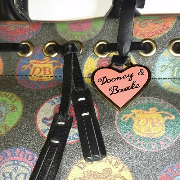 Genuine Dooney & Bourke rainbow hearts & tassel tote with top magnetic snap closure. Features black coated canvas with multi colored signature D & B medallions all over. Signature goldtone & pink enameled Dooney & Bourke purse fob/hangtag. Detachable black leather shoulder/crossbody Strap. Side has black leather trim with drawstring pulls. Front decorative drawstring & tassel.Interior has four open slip pockets. Preowned & pristine. Smoke free. Serial number sewn inside bag. PRICE IS FIRM.