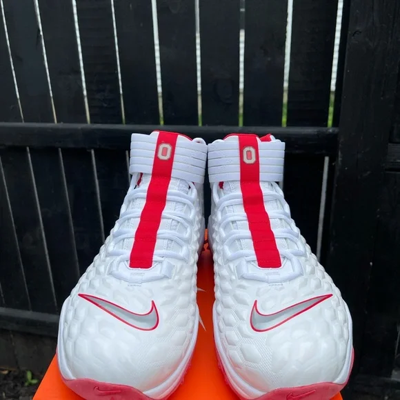 Nike Ohio State PE Force Savage Pro 2 Shark Linemen Football Cleats Size 18 NWB. Very rare player issued cleats specially made for the Ohio State football team! Color is white/red/gray. Men’s size 18. Rubber bottom cleats. Linemen cleats. Brand new without box. I have the box for these cleats but I will not be shipping them with the cleats as the box is very big and bulky. All orders ship within 1 business day! Authenticity guaranteed!