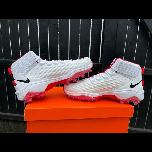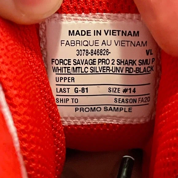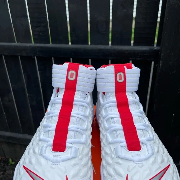 Nike Ohio State PE Force Savage Pro 2 Shark Linemen Football Cleats Size 14 NWB. Very rare player issued cleats specially made for the Ohio State football team! Color is white/red/gray. Men’s size 14. Rubber bottom cleats. Linemen cleats. Brand new without box. I have the box for these cleats but I will not be shipping them with the cleats as the box is very big and bulky. All orders ship within 1 business day! Authenticity guaranteed!