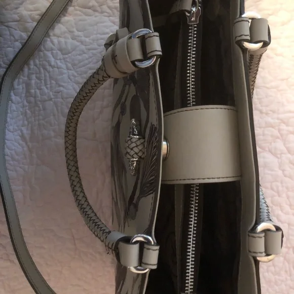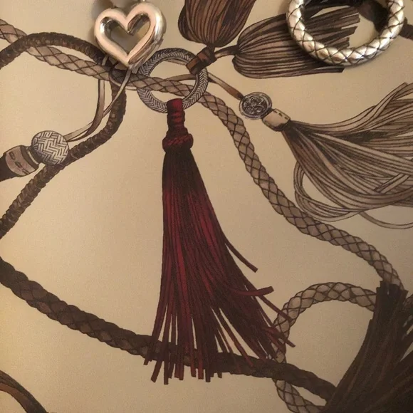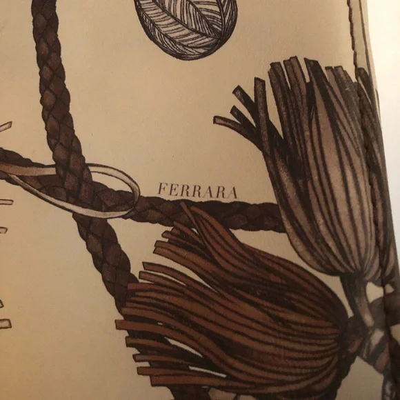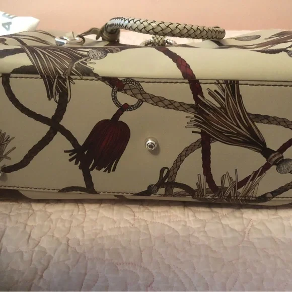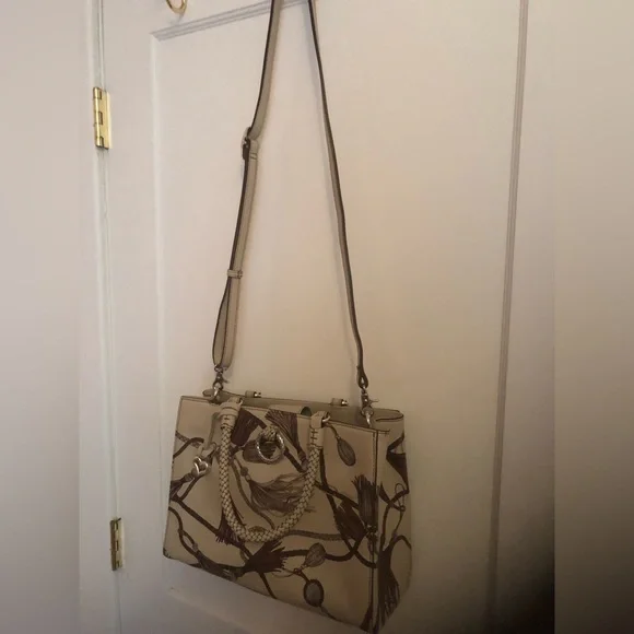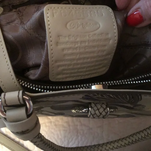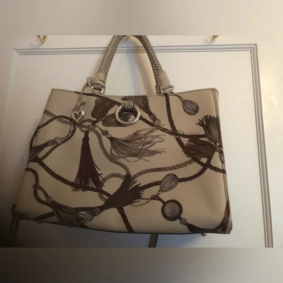 Very rare Brighton Ferrara painted design. Tassel print has beige background with hints of brown and wine. Very neutral. Braided leather handles and removable cross body strap....